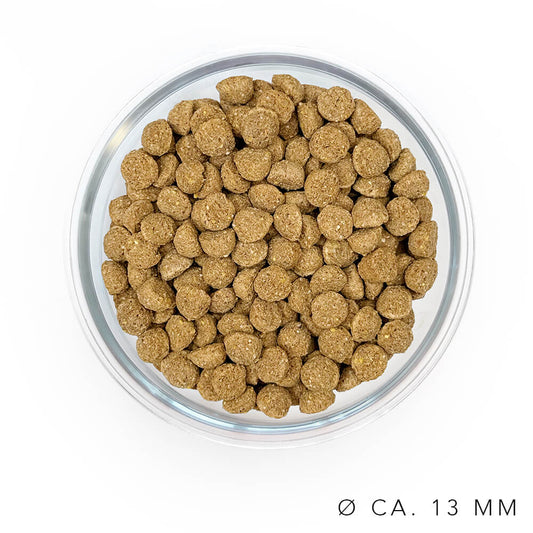 Unser Trockenfutter steht für Qualität und sorgfältig ausgewählte Zutaten, die deinem Hund ein gesundes und glückliches Leben ermöglichen. Jede Sorte entwickeln wir mit höchster Sorgfalt gemeinsam mit Tierärztinnen, um sicherzustellen, dass es die Bedürfnisse deines Hundes vollständig abdeckt. Dein Hund liegt uns am Herzen und es ist unser Ziel, möglichst vielen Hunden ein passendes und unwiderstehlich leckeres Futter anzubieten.